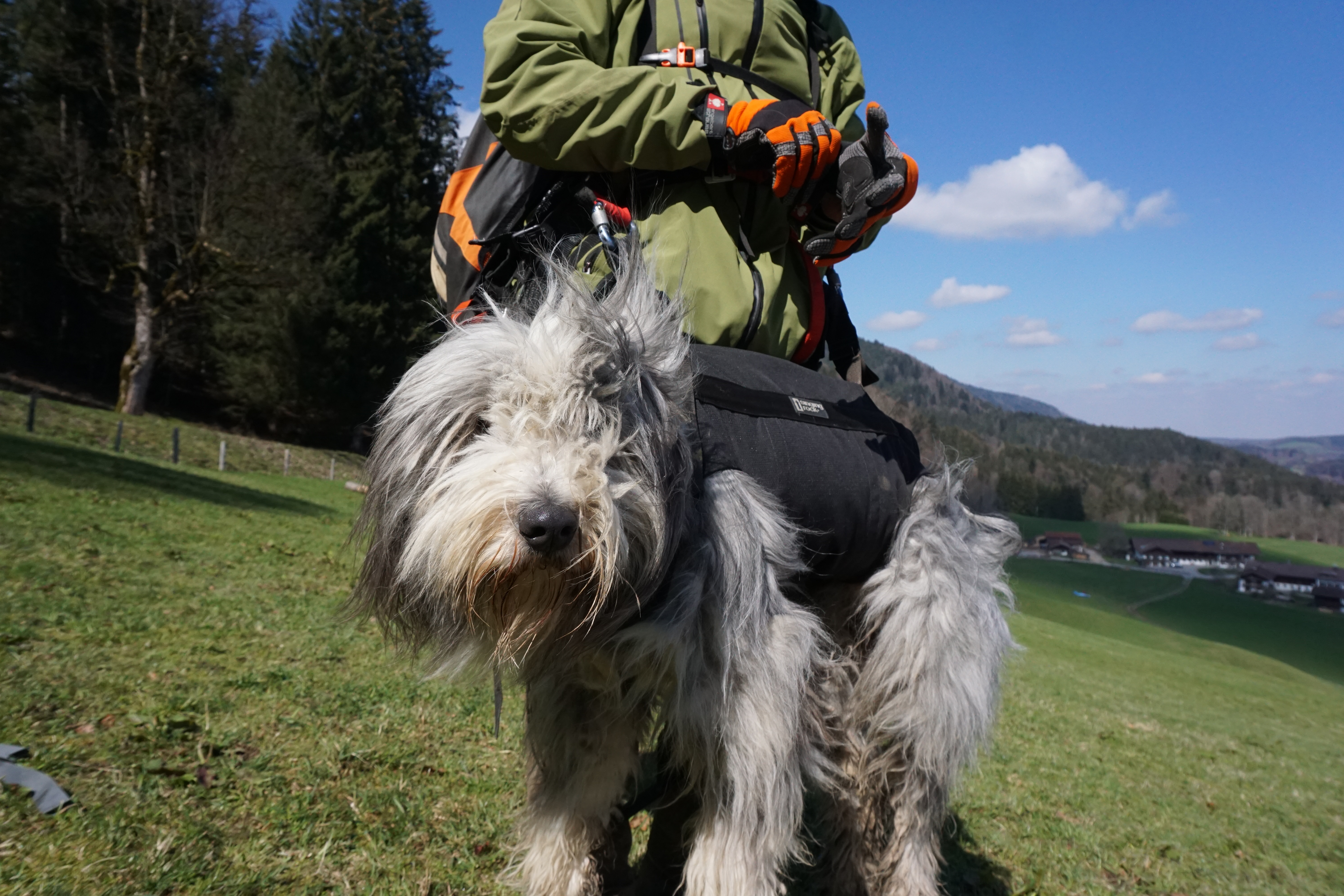 Mit der Extraportion Fleischwurst und Leckerli war auch das kein Problem. Beim Hinsetzten und Reinrutschen in mein Gurtzeug hat er zum ersten Mal ganz kurz gestrampelt. Wir wollten es nicht übertreiben und haben nur ca. 10 Minuten zusammen getestet. Danach Aufstehen, den Hund absetzen und viel loben. Das werden wir jetzt noch ein paar Mal wiederholen, bis es auf den Hang geht.