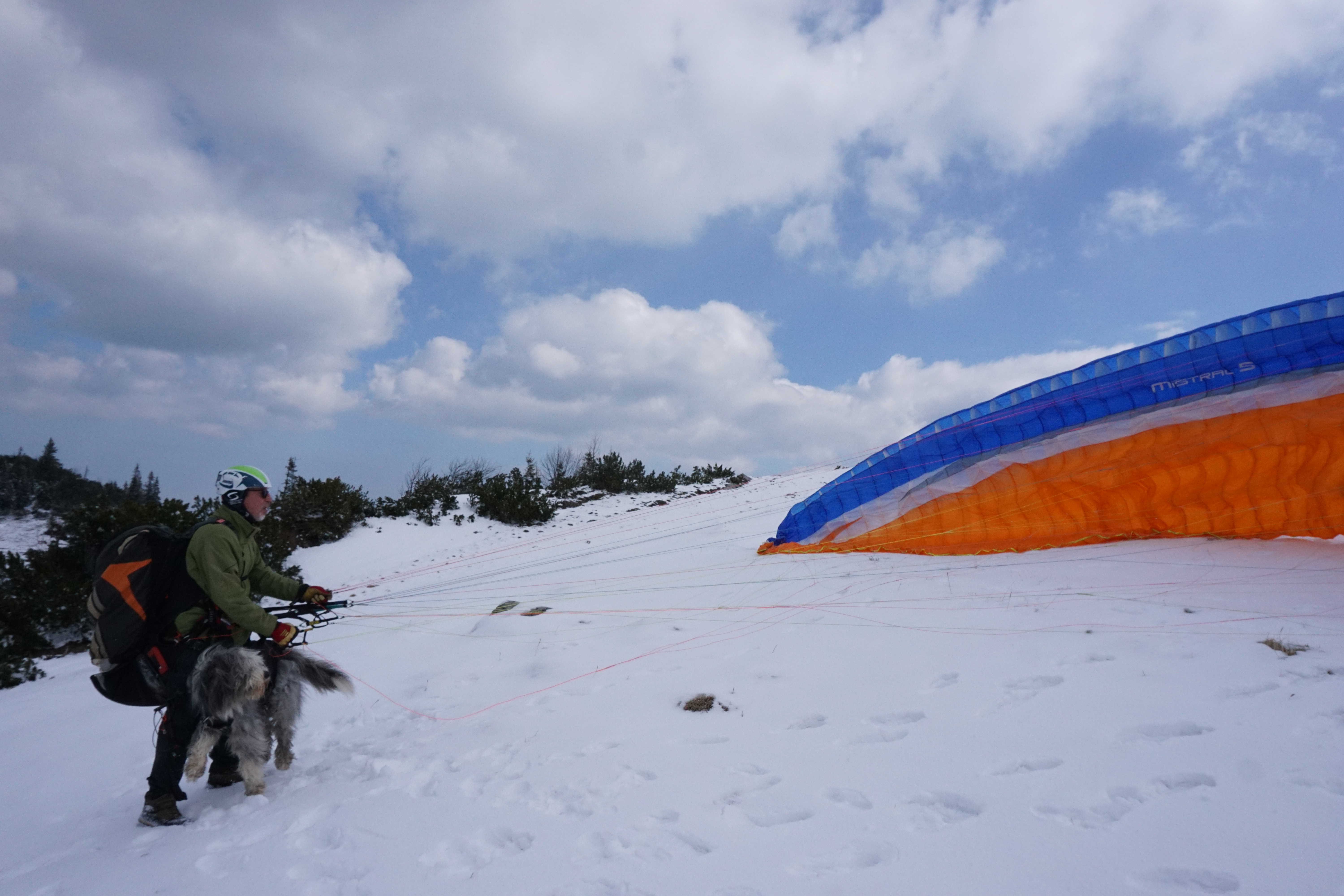Zuerst haben wir den Fluglehrer unseres Vertrauens angerufen (Klaus Schwarzer von FlyART). Ob er uns unterstützen möchte? Ein klares Ja. Dann die Suche nach einem geeigneten Gurtzeug für den Hund: Es gibt nicht so viele, wir haben uns für das Laika von Singing Rock entschieden. Relativ günstig, super verarbeitet und hat auf Anhieb gepasst. Negativ nur, dass die Aufhängungen zu lang sind, da sie für Hundetransport z.B. im Heli gedacht sind. Wir haben dann die Gurte gekürzt und schon baumelt der Hund nicht mehr vor dem Oberschenkel herum.