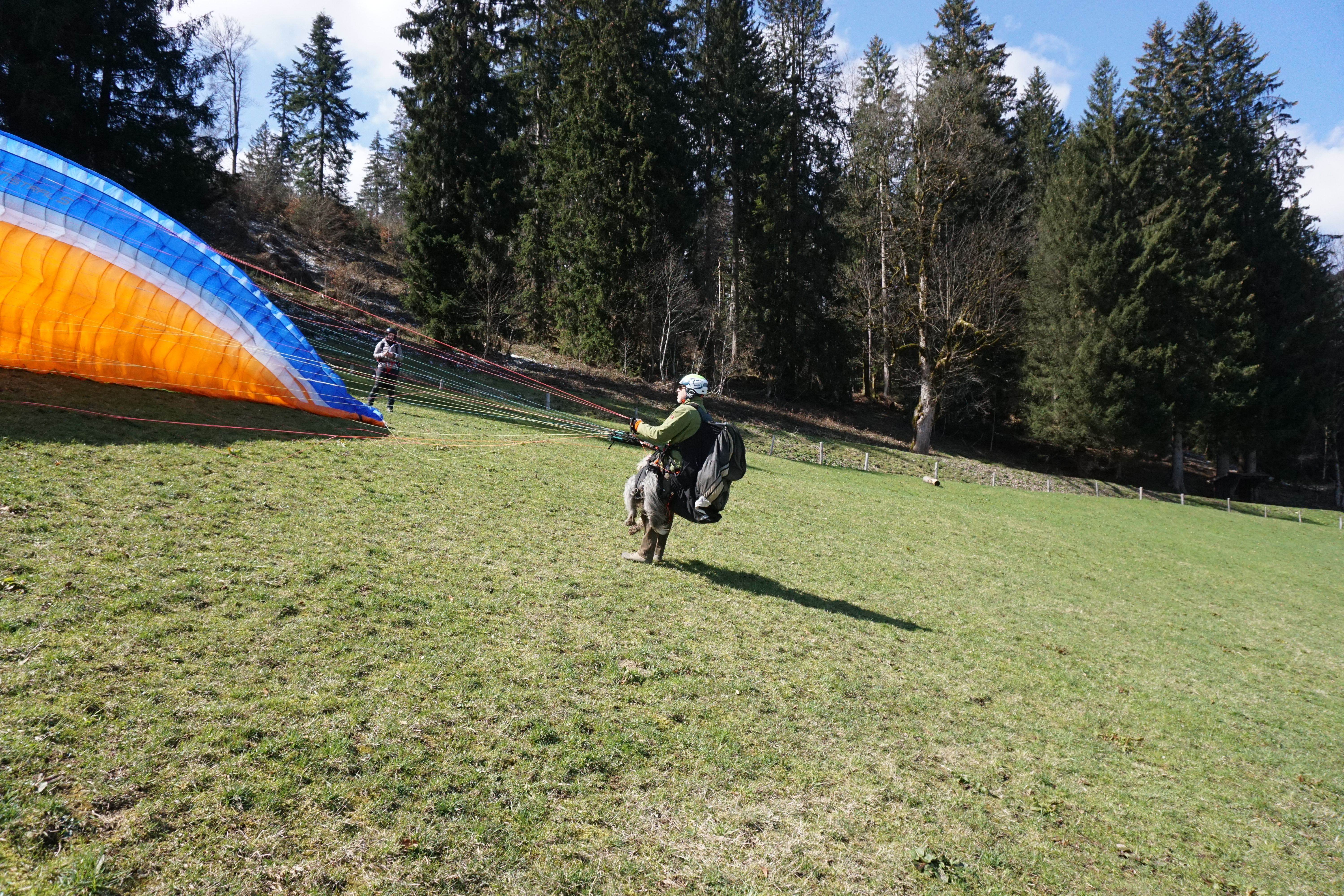 Wir trafen uns wieder am Übungshang und der Plan war, Bolle weiter in aller Ruhe an das Rascheln des Schirmes zu gewöhnen. Dank der Geduld und des Einfühlungsvermögen von Klaus wurde Bolle immer ruhiger. Dann habe ich mir Bolle vor den Bauch geschnallt. Eigentlich wollte ich nur den Schirm aus der Hand wiederholt aufziehen und ablegen. Siehe da, Herr Bolle war entspannt. Klaus sagte: „Dann häng dich ein und starte mal.“ Aber äh Moment mal… jetzt schon? Echt jetzt?