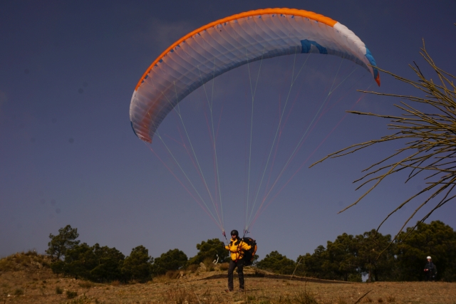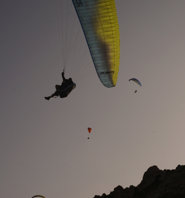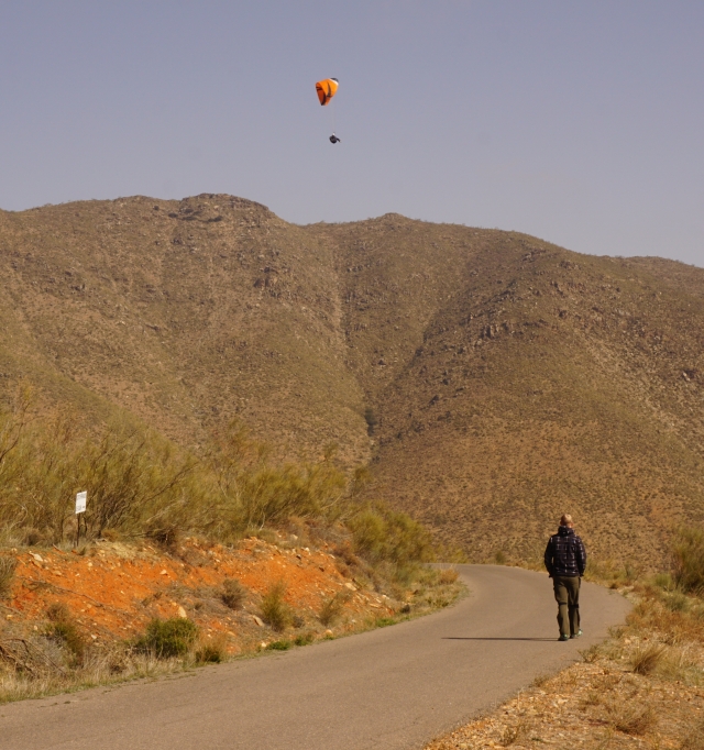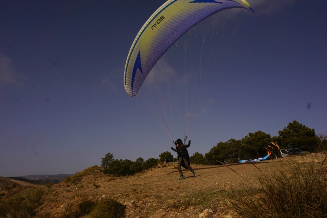 An den ersten beiden Tagen war küstennah sehr starker Wind, also fahren wir ins Landesinnere zur Eremitage. Ein schöner Startplatz, gut angeströmt, der Flug führt über ein breites Tal um dann in einer Kehre des Bachbettes zu landen. Das flösst am Anfang Respekt ein, dann aber stellt sich die Landung im gleichmässigen Wind doch als gut machbar heraus.