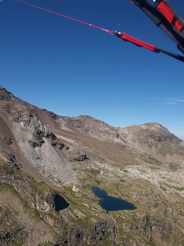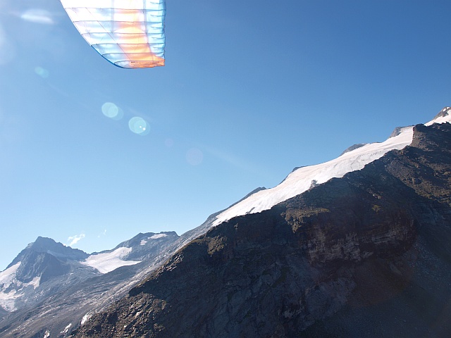 Am nächsten Morgen geht es früh los. Ich rechne mit weiteren 3 Stunden Aufstieg, auf der Hütte kann ich ja kein Gepäck lassen, da der Plan, ins Tal zu fliegen, sehr realistisch ist. Wenig Wind und blauer Himmel versprechen beste Bedingungen. Auf einem Bergpfad geht es Richtung Antholzer Scharte und dann auf der steingen Seitenmoräne des ehemaligen Gletschers bis zum Schneefeld. Es ist flach und über Nacht nicht gefroren. Steigeisen sind heute also unnötig wie auch die Gletscherausrüstung zur Sicherung und Spaltenbergung. Auf Schnee geht es dann die letzten 300 Höhenmeter bis unter den Magerstein. Den Gipfel schenke ich mir, da der Wind auf dem Gletscher gerade ideal ist. Nach einer kurzen Brotzeit starte ich am Vormittag auf dem flachen Gletscher problemlos. Ein toller Flug mit herrlichen Blicken schließt sich an. Die Bergsteigerkollegen schauen mir neidisch nach, wie ich lautlos zu Tale gleite. Sie haben einen noch mindestens 3 stündigen Abstieg vor sich. Nach gut 20 minütigem Flug lande ich sanft in Rein und hole mir in der Alpenrast den wohlverdienten Strudel.