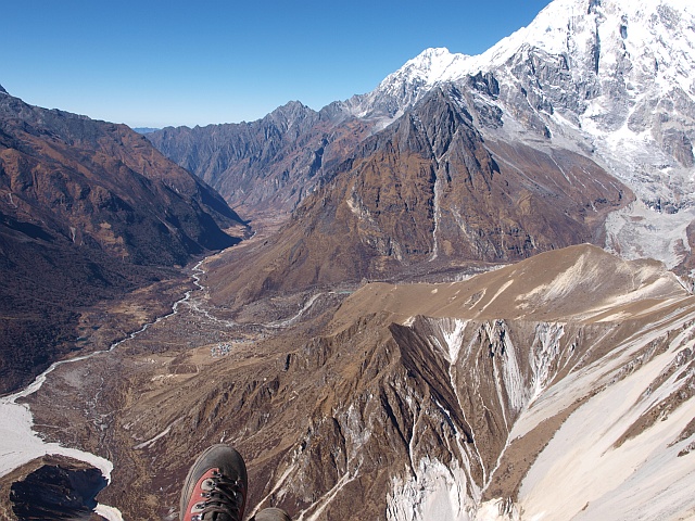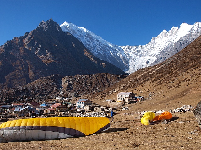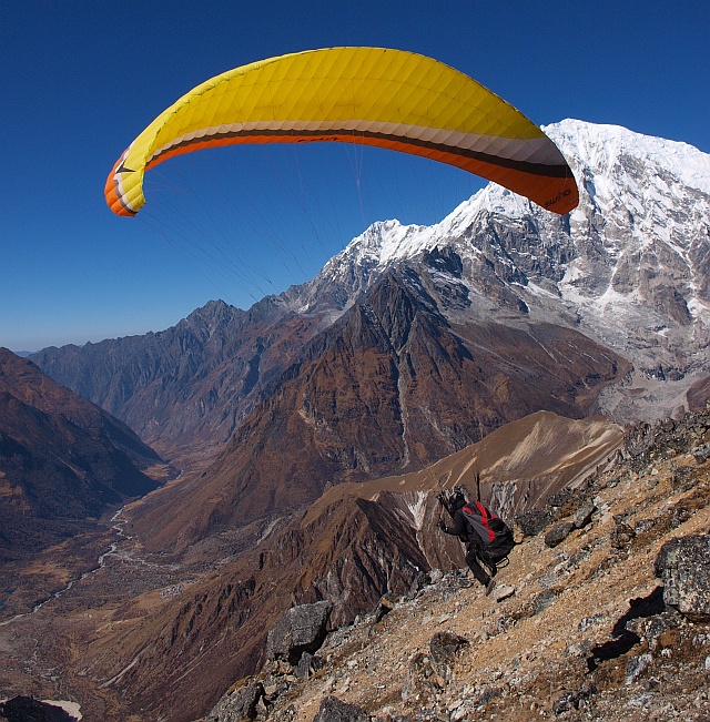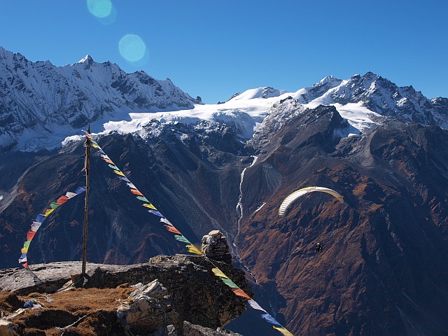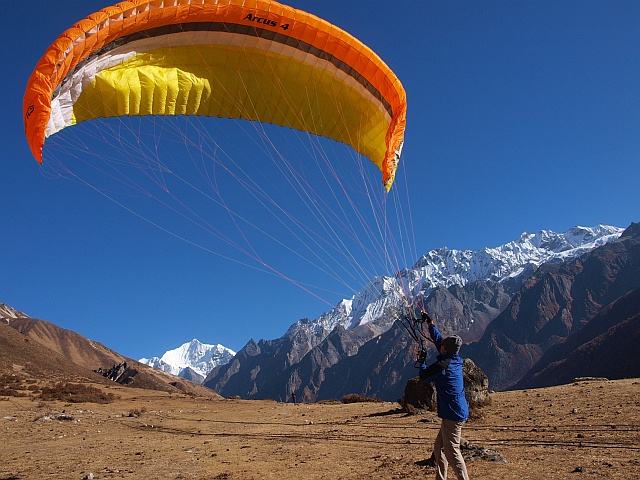 Im November 2012 starteten eine 8 köpfige Fliegergruppe, organisiert von FlyART und Mayatrekking, aus Katmandu nördlich in das Trisuli Tal.Von dort ging des dann nur noch zu Fuß weiter nach Birdim, Sherpagoan, Langtang bis Kjangi Gumba, ca. 3.900m. 2 Tage blieben wir hier oben und erstiegen den Tsergo Ri, 4.986m um anschließen phantastische, thermische Flüge nahe der Grenze zu Tibet zu zelebrieren.
