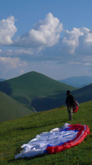 Nach dem Franzl-Gedächtnisflug führt unser Weg endlich in das Mekka der Flieger: Castelluccio mit seiner riesigen Badewanne lockt. Hier verbringen wir die letzten Tage und fliegen, was das Zeug hält. Aus der Ebene erhebt sich ein idealer Übungshang, der sich bestens zum Training von Rückwärtsaufziehtechniken eignet. Der Piano Grande wird von allen Seiten von Startplätzen begrenzt, die mit dem Auto oder zu Fuß gut erreichbar sind. Dort gibt es ein typisch thermisches Vormittagsfluggebiet sowie ein Abendflugplatz, eher zum soaren... Mittags halten wir gerne eine "Siesta", der Wind kann stark werden.