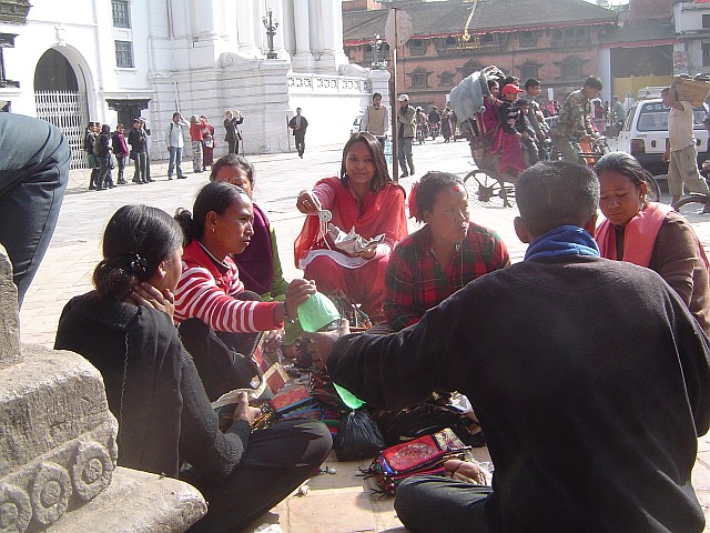 |  Auch während er Brotzeit bieten sie mir ein Amulett an. ! | Strassenverkäuferinnen im Zentrum Katmandus |