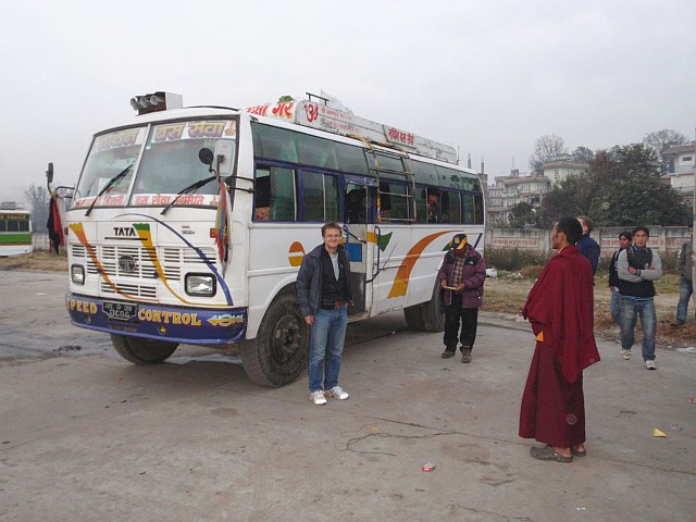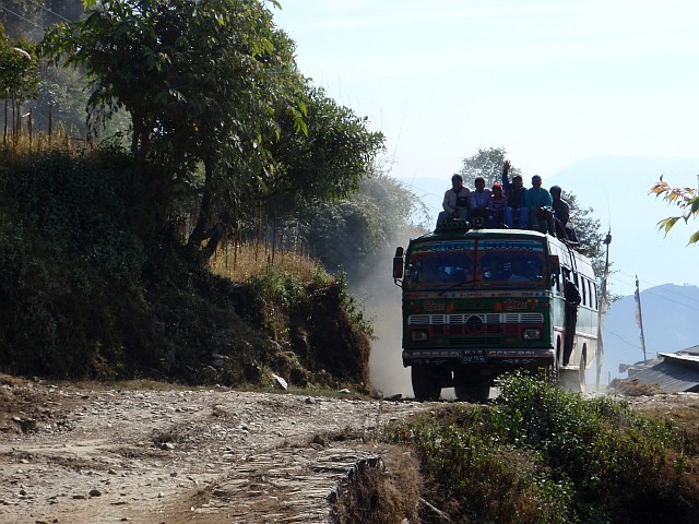 Alleine die Busfahrt ist eine Geschichte wert. Der Bus, ca. 30 sitzig, fährt in Kathmandu nach unseren Begriffen voll los. Nach 500 m. steigen mindestens 10 weitere Nepali ein. An der nächsten Kreuzung erneuter Halt, die ersten Fahrgäste steigen zum Gepäck aufs Dach. So wird mit jedem weiteren Stop die Anzahl der Mitreisenden immer grösser, bis ich auf eine grob geschätze Fahrgastzahl von 60 bis 70 komme. Reissäcke und andere schwere Güter nicht mitberechnet.