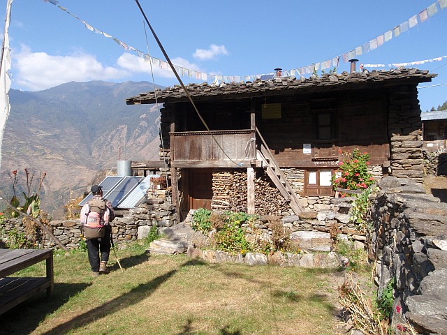 Der erste Aufstieg führt uns zu Fuß von 1460 m nach Briddhim, 2200 m. Die ersten sportlichen Schweisstropfen rinnen. Wir besuchen das Dorf von Freunden und werden superherzlich bewirtet. Der erste Eindruck: friedliches problemloses Landleben. Wir sitzen in einem typischen Sherpa-Tibet Haus, gebaut aus Natursteinen und Holz, unten ein offener Stall, darüber das "WohnEssSchlafKüchenVorratszimmer".