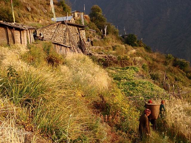 Sherpa Goun, einem 10 Häuser Weiler an der riesigen Bergflanke, die wir entlangwandern. Ein kleines Gasthaus läd uns zum Bleiben ein. Der Nachbar erntet noch Weizen auf ca. 2600 m Höhe. Zwischen zwei Stöcke nimmt er eine Anzahl von Weizenhalme, reißt die eingeklemmten Fruchtstände von den Halmen ab und befördert diese dann in einen landestypischen Korb. Dies Art der Ernte sah ich vorher noch nicht.