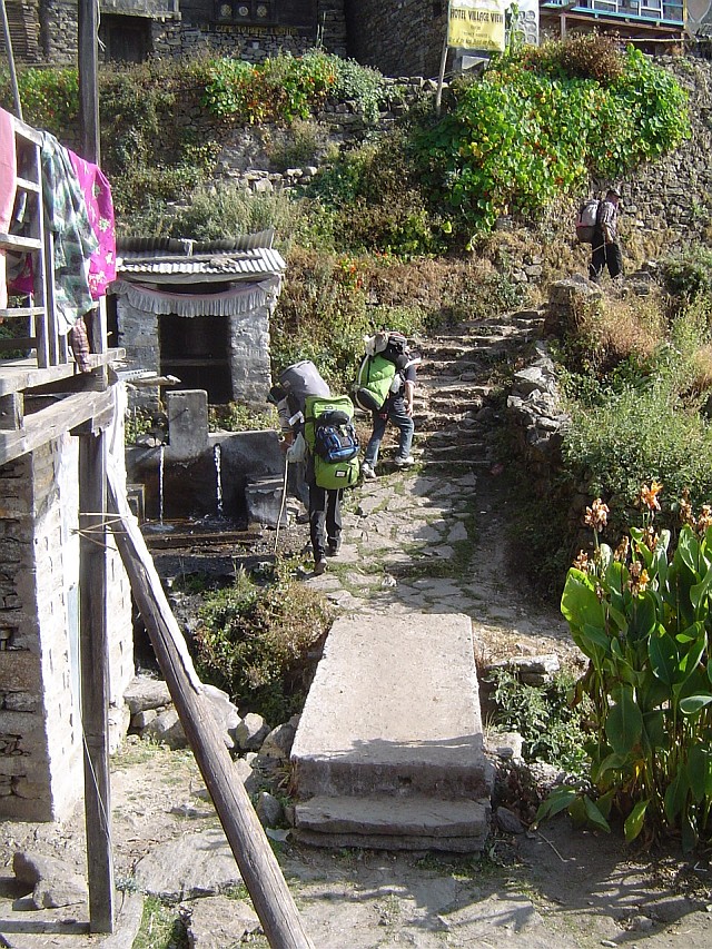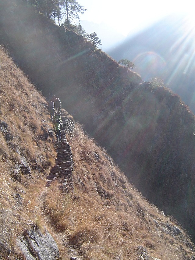 Wir wandern mit leichtem Gepäck und den Trägern im Gefolge weiter aufwärts. Blonde Schwedinnen und ein südamerikanischen Holländer kommen uns entgegen. Wir gehen auf den alten Wegen, die seit Jahrhunderten die Dörfer der Langtang Sherpas, ehemalige Tibeter, die schon vor langer Zeit ins warme Nachbarland eingewandert oder neuerdings geflohen sind, verbinden. Treppen aus großen Steinstufen überwinden steile Passagen, dann geht es wieder flacher am Hang entlang, durch kleine Kiefernwälder, tolle Aussichten geniessen wir auf diesem Höhenweg Richtung Langtang.