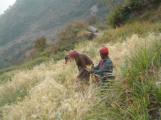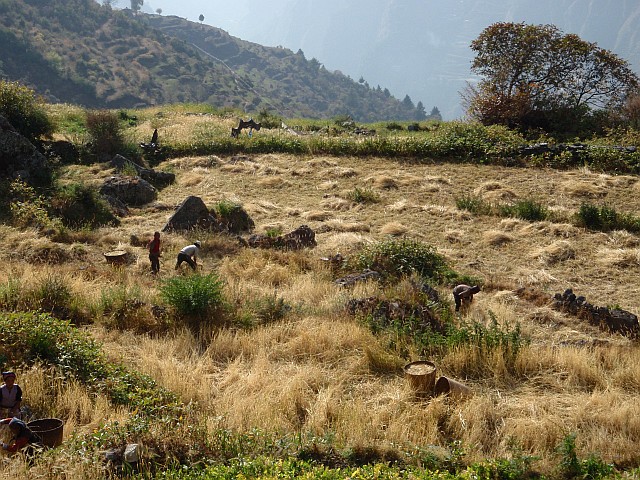 |  Viele Sherpas helfen zusammen. | Weizenernte noch wie früher |