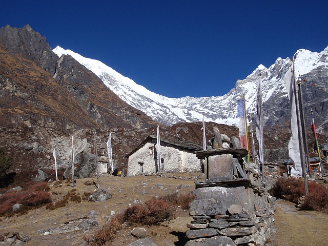 |  ... vor großartiger Kulisse der Langtang Berge. | buddhistische Gebetsfahnen ... |