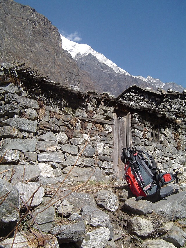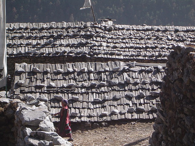 Wir sind jetzt über 3300 m. hoch. Die Baumgrenze haben wir längst überschritten, jetzt finden wir Pferde als Tragetiere und die typischen stolzen Yaks als Trage- und Nutztiere. Wir besichtigen eine Gompa, ein lokales Kloster, finden dort aber nur geschäftstüchtige Frauen. Sie sitzen vor einem Haus im Yak Dung und spinnen. Die alten Bauernhäuser in tibetischen/sherpa Stil bestehen aus Natursteinen und Holz, das im Verlauf der Zeit stark gedunkelt ist. Die Dächer sind mit Holzschindeln gedeckt und gegen Sturm mit Steinen beschwert, wie bei uns uralte Berghütten. Ein runder Anblick, keine Schornsteine oder Antennen verunzieren die alten gewachsene Ensemble. Rundherum blicken jetzt nur noch weisse Berge auf uns herab. Nach der langen Wanderung fallen wir abends früh in tiefen und erholsamen Schlaf.