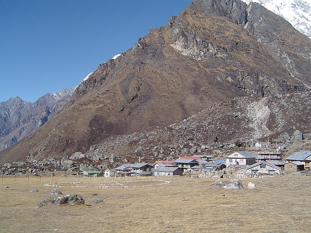 Der nächste Wandertag ist nur kurz. Durch das Tal schreiten wir weiter aufwärts nach Kyangij. Auf 3700 m liegt dieser schöne Ort in dem jetzt breiten Tal. Sonnenschein den ganzen Tag, wir verbringen den Nachmittag mit Laufen (Wini) und ich mit einer Bergtour in ein Nebental. Zur kurzen Akklimatisation schaue ich mir die Gletscher und verschwundenen Glertscher an. Im Ort selber findet sich ein kleines Kloster Kyanjin Gompa ohne Mönche, die faulen Socken sitzen lieber bequem im warmen Kathmandu. Eine Käserei verarbeitet die Yak-, besser den Susumi Milch zu einem schmackhaften Gebirgskäse. Wir holen uns ein gutes Stück davon. Den Abend verbringen wir in einem kleinen privaten Gasthaus, betrieben von einem Einheimischen, der auch als Bergührer arbeitet samt Frau. Ein nettes kanadisches Pärchen teilt sich mit uns die Lodge.