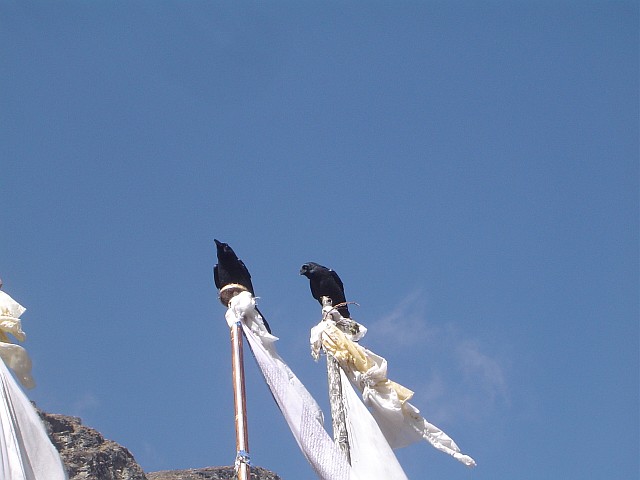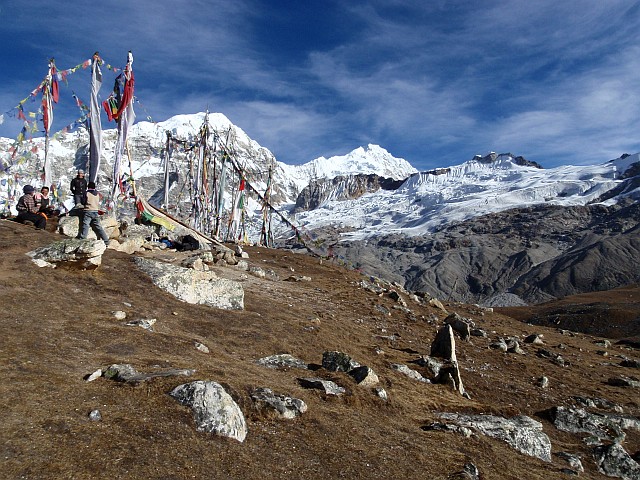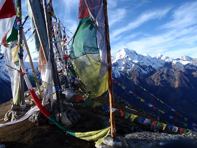 |  des Tsergo Ri, 4984 m. Sie flattern ihre Wünsche in die Luft, so gehen sie in Erfüllung, hoffen die Buddhisten | Gebetsfahnen am Gipfel |
