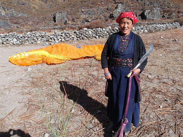 Während des Fluge habe ich meinen Freund in der Luft gesucht, doch jetzt am Boden stehendend sehe ich ihn starten. Der Wind drehte oben in der Wechselphase zwischen Berg- und Talwind, sodass Wini die thermische Seite zum Start nutzte. Derweil sammeln sich einige Sherpas um mich herum. deren Englisch ist nicht so schlecht, so dass ich ihnen etwas zum Gleitschirmfliegen erklären kann. Besonders sind sie über die Kraft der dünnen Leinen und der Haltbarkeit des dünnen Stoffes erstaunt. Wini fliegt am Hang entlang und fotografiert. Damit kann er der optimalien Linie schlecht folgen. Doch die Bilder sind es wert, einige Schritte zu laufen. Er bewegt sich dann in meine Richtung und landet etwas kürzer. Wir treffen uns dann bei einem guten Kartoffelgericht im Gasthaus zu Langtang.