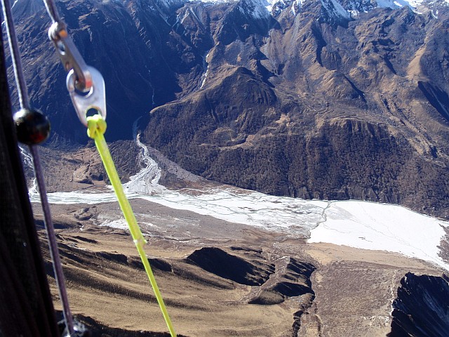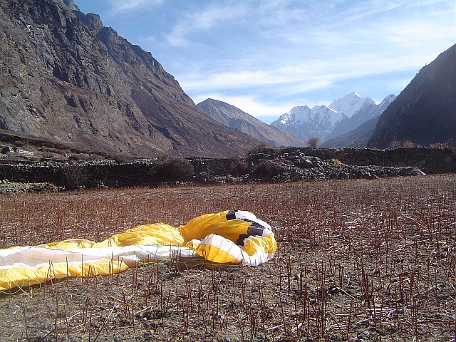 Windfahnen also braucht es hier oben also nicht. Wir nutzen eine frühe, noch nicht thermische Stunde um zu fotografieren, uns auszuruhen, die gute heimische Schoki zu mampfen. Derweilen kommt eine Gruppe Franzosen hier oben an, ohne Schirme. Sie schauen interessiert unseren Startvorbereitungen zu. Der Wind ist zum Teil als Bergwind aber auch schon als thermischer Talwind zu spüren. Ich nutze den flachen Startbereich, der vom Bergwind gut angeströmt ist zum Starten. Nach ca. 100 Flugmetern biege ich rechts über eine steile Kante ab in die bereits schwachen Aufwinde. So gleite ich weit mehr als 1000 m über Grund durch eine phantastische Kulisse von vielen 5000er, 6000er und 7000er. Gletscher wechseln sich mit riesigen Sandreisn und felsigen und verschneite, steilsten Bergen ab. Vor lauter Schauen vergesse ich das Fotografieren. So fliege ich wie im Traum über Kyangij, über weite Almen das Tal auswärts, das wir vorher zu Fuß erstiegen haben. Nach ca. 10 km ist der Flug abrupt zu Ende. Ich stehe kurz vor Langtang wieder auf dem Boden. Aus der Traum.
