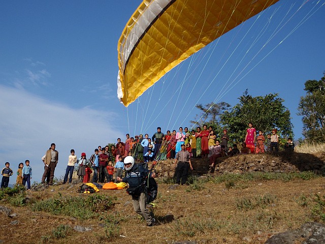 Am nächsten Morgen kocht unser Sirdar Kami uns ein gutes Frühstück. So gestärkt laufen wir durch die abgeernteten Felder zu einem schönen und gut angeströmten Startplatz. Jitman will zeigen, was er noch kann und macht sich als Erster fertig. Ca. 50 Nepali sind von seinem guten Start begeistert und klatschen ihm lange hinterher. Wini und ich folge ihm zu einem ganz anderen tollen Flugerlebnis: Am Hang siedeln etliche Schulen. Die Kinder haben gerade frei oder Pause. Alle schreien sie und winken uns zu. Der Hang lebt! Ein tolles Erlebnis, wenn man in der Luft so gefeiert wird. Dies spiegelt noch ein bischen die Stimmung bei meinen ersten Flügen in Nepal aber auch in den Alpen wieder. Aber das ist schon 20 Jahre her.
