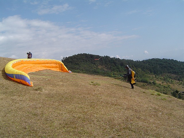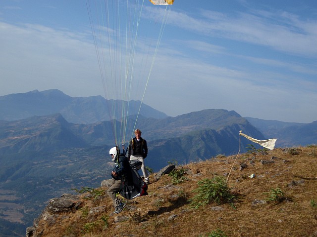 Um drei Uhr stehen wir am Startplatz in Bandipur. Ein kurzer Aufstieg auf der Ostseite der Ridge brachte uns schnell hierhin. Der Wind ist ideal zum Rückwärtsstarten, gleichmässig mit 10 - 15 km/h. Jitman denkt, das wäre für ihn schon zu viel. Etwas skeptisch baut er seine Ausrüstung auf. Doch nach meiner Versicherung, das ideale Bedingungen herrschen, vertraut es sich den tollen Bedingungen an. Er macht den längsten Flug seines Lebens. Wini und ich überhöhen die langezogen Kante um einiges. Der nachmitttägliche Thermik sind schon alle spitzen Zähne gezogen, so geht es leicht und bequem nach oben. Jitman dreht immer wieder vorsichtige Kreise in der Thermik und freut sich wie ein Kind über diese neue Art zu fliegen.