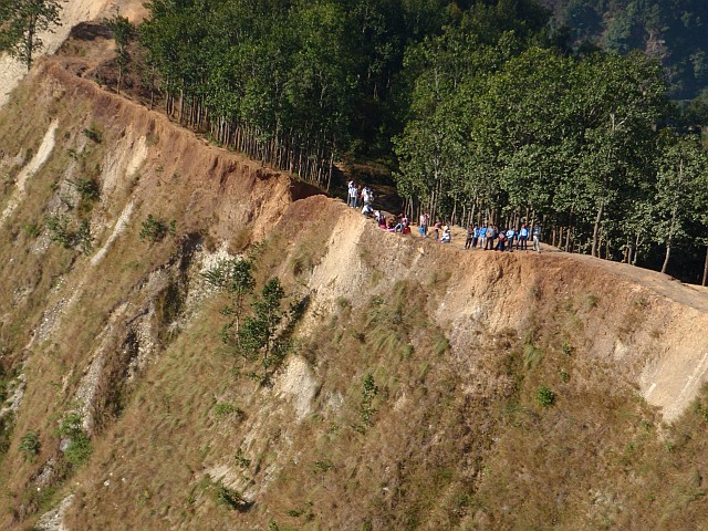 Der localbus führt uns einige Kilometer zurück. Wini steigt in Laufklamotten aus, ich steige ca 10km später aus und wir laufen mit getrennten Geschwindigkeiten unserem heutigen Ziel entgegen: Kalikastan liegt oben am Berg und soll über einen Startplatz verfügen. In einem Nepali Hotel finden wir Quartier. Jitman stöß am Abend zu uns. Große Wiedersehensfreude, da er meinen mitgebrachten Schirm auch schon in Pokhara probegeflogen ist, bzw. er sich sicher sein wollt, noch selber nach so langer fliegerischer Abstinenz fliegen zu können.