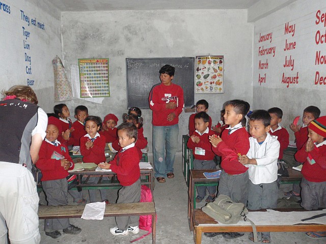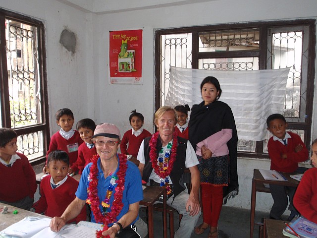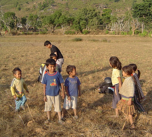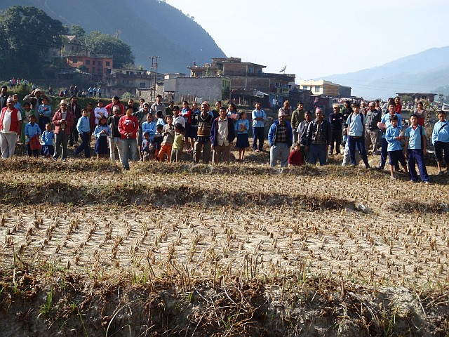 Ich fliege dicht am Hang über etliche Menschengruppen hinweg, sie winken und freuen sich, so ein buntes Ding nahe vor sich in der Luft zu sehen. Ca. 20 Minuten lassen wir uns in der Luft feiern, dann müssen wir an die Landung denken. Ein breites Tal mit Reisanbau in flachen Terassen ist unser Landefeld. Betrawali, so der Name des nahen Ortes, hat seinen Schülern auch freigegeben. Die Bevölkerung steht auf einer Strassenbrücke und schaut unserern Landemanövern zu. Nach der Landung sind wir schnell umringt von wissbegierigen Nepali. Zwei Lehrer machen auf sich und ihre Schule aufmerksam. Girlanden schmücken uns Flieger wieder und ein Schulbesuch ist schnell vereinart. Wir nehmen dort alle guten Wünsche und bunte Blütenblätter von allen Schülern sowie erneut Blumengirlanden entgegen. Eine Spende ist uns das dann schon wert. Auch wollen sie Schulpatenschaft für 500 Rupien (5 €) an den Mann und nach Europa bringen. (Info siehe unten)