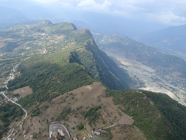 Wir starten heute faul vom Tandemstartplatz und sehen dabei den guten Standard der nepalesischen Piloten! Wieder fliegen wir mit den Adlern um die Wette bis zur Basis hinauf. Aus der Luft heraus erkenne ich Damphus, einem Startgelände vergangener Tage. Die richtig hohen Berge der Region, der Annapurna, Manaslu und Macchpucchiarre bleiben leider in Wolken verborgen. Nach einer Stunde langt das hier das Fliegen, zumal wir nochmals nach Bandipur schauen möchten.