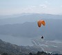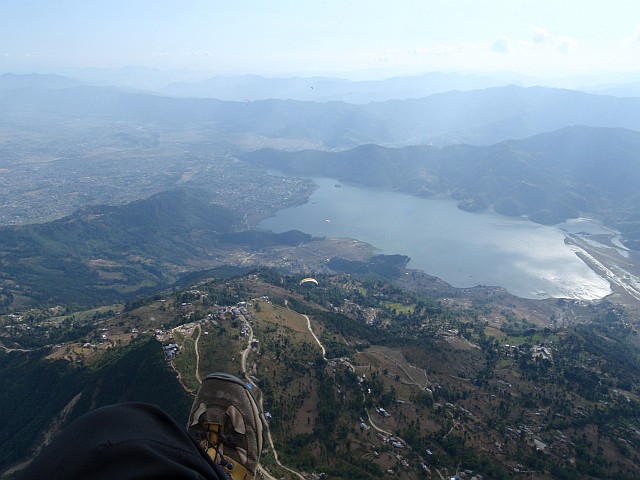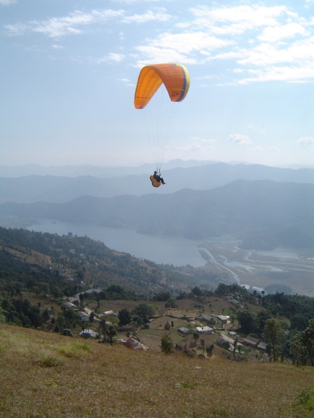 Sarangkot hinauf chauffieren. Jetzt finden sich hier drei Startplätze, aufgeteil nach Schulen und Tandems. Wir laufen eine halbe Stunde zu unserem alten Startplatz auf 1600 m., den wir vor Jahren als Abschlußflug beim Annapurna Trekking genutzt hatten. Drei Topgelandete Piloten treffen wir hier an. Da es also bereits thermisch ist, wie es auch an den vielen Piloten in der Luft zu sehen ist, bereiten wir gleich unseren Start vor. Wini als Vorflieger für Jitman und ich als Fotograf und Startleiter für Jitman als letzter. So schwingen wir uns in die Luft und wie gut es heute geht! Wir sind schnell unter der Basis. Dabei können wir uns an Adlern, die von unten immer wieder aufsteigen, orientieren. Im thermischen Drehen sind sie nicht mal viel besser wie wir Schirmflieger. Bis auf 5 m komme ich so den Gefiederten nahe. Sensationelle Momente in der Luft. Für Jitman, dem das ganze thermische Fliegen bis dahin unbekannt ist, stellt diese Fliegerei ein Traum dar. Früher war er es gewohnt, vom Startplatz direkt zum Landepunkt zu fliegen, jetzt hat er neue Freiheiten gewonnen. Dementsprechend aufgekratzt ist er auch nach der Landung am Ufer des Pewa Lake.