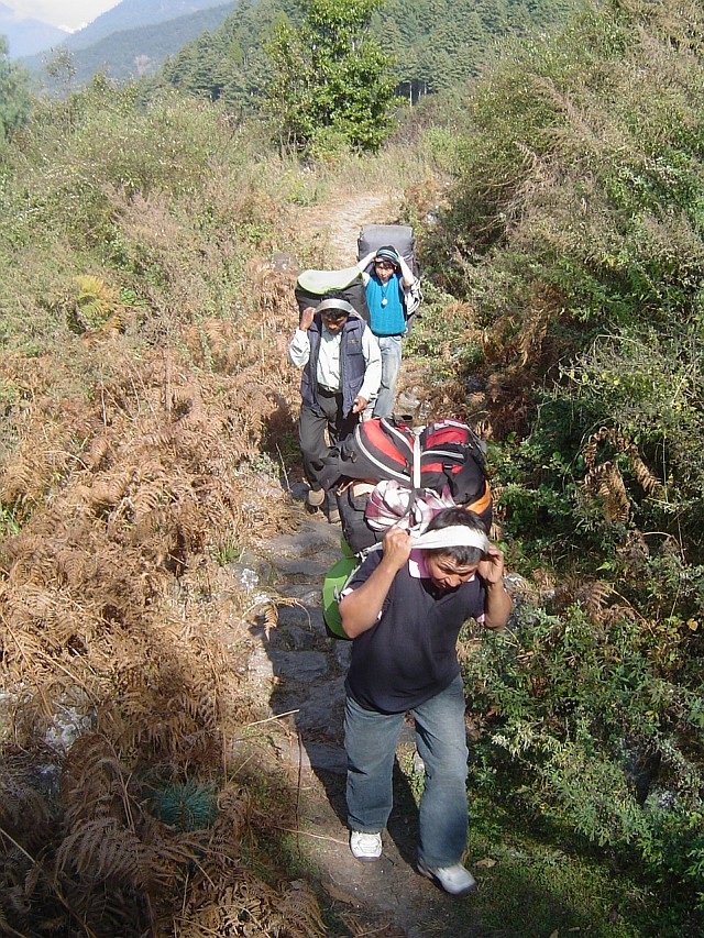 Nach einem kurzem Frühstück in der morgendlichen Kühle beginnt der nächste Wandertag. Unser Höhenweg windet sich ins Tal hinunter und wir folgen jetzt dem Bachlauf aufwärts. Große Bäume, Rhododendren meist, säumen den Weg, einige Trekkinggruppen überholen wir oder kommen uns entgegen. Franzosen, Israeli, Belgier, ein buntes Völkergemisch, doch es sind keine Deutschen darunter. Wir Deutsche sind doch viel zu vorsichtig für solch ein tolles Abenteuer.