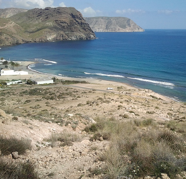 ..fahren wir an Almeria vorbei in das Naturschutzgebiet Cabo de Gata zum Martin und Annika. Herzliche Aufnahme und gleich ins Auto, um die Attraktionen des Naturreservats anzuschauen. Es lohnt sich! Wir lernen eine wunderschöne ruhige und unverbaute Landschaft kennen. Die Bauwut hat in diesem noch einsamen Winkel Spaniens noch nicht zugeschlagen. Wo sich füher Freibeuter und Piraten in einsamen Buchten verstecken konnten, sind diese Sandstrände auch heute noch in ihrem ursprünglichen Zustand. Nur sanfter Tourismus soll in diese Region Fuß fassen. Outdooraktivitäten wie MTB fahren, Windsurfen, Kiten Wander, Reiten, Tauchen sowie Gleitschirmfliegen werden unterstützt. So sind verschieden Berge in der Zulassung und werden auch schon beflogen. Direkt an unsere Unterkunft ist ein 50 m. Übungs- und Soaringhügel. Ideal zu trainieren.